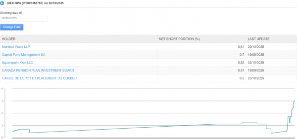 Attualmente il 3.04% del capitale è venduto allo scoperto da 5 investitori con una crescita del 151% negli ultimi 30 giorni . Monitoriamo attentamente l’evoluzione delle PNC nel corso dei prossimi giorni