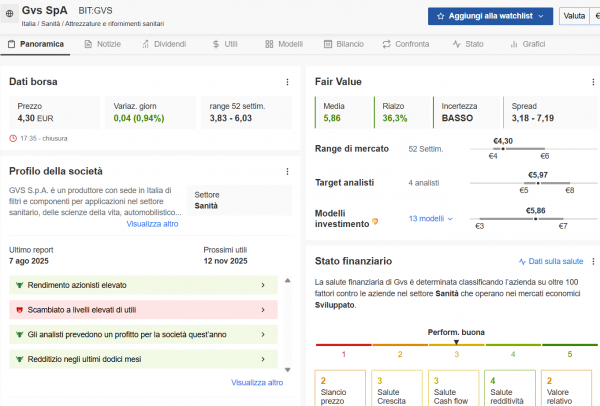 GVS  ha un buono stato di salute finanziaria ed è fra i titoli più sottovalutati e con secondo InvestingPro. La Media dei 13 modelli di investimento utilizzati individua un Fair Value a 5.86€ con un Rialzo potenziale  36.3%.