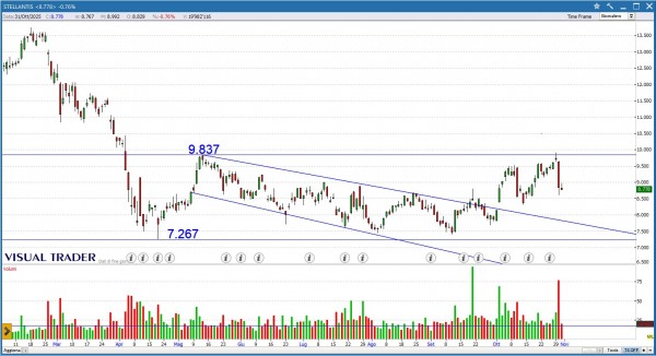 STELLANTIS dopo aver testato la resistenza chiave a 9.85€ viene colpita da un violento sell off a seguito della pubblicazione dei risultati. I prezzi rimangono ingabbiati da ormai 147 sedute all’interno di un grande rettangolo: solo la fuoriuscita da questo box, darà indicazioni sulla direzionalità del titolo