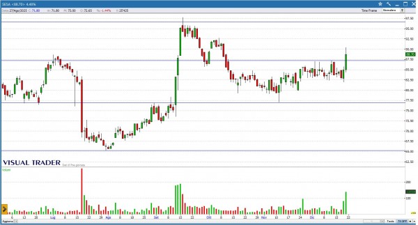 SESA disegna una Long white che supera di slancio la resistenza passante in area 87.3€. Possibile un ulteriore allungo verso area 95€