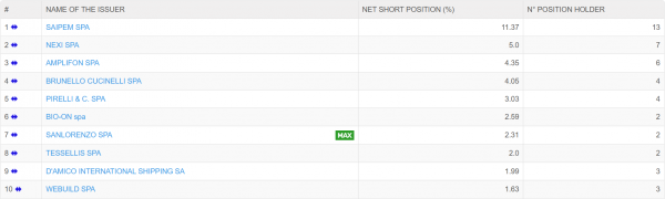 SAIPEM rimane il titolo più nel mirino delle Mani Forti (come evidente dall’immagine dei 10 titoli più shorati elaborata da Big Short Hunter https://www.sostrader.it/big-short-hunter-lp)