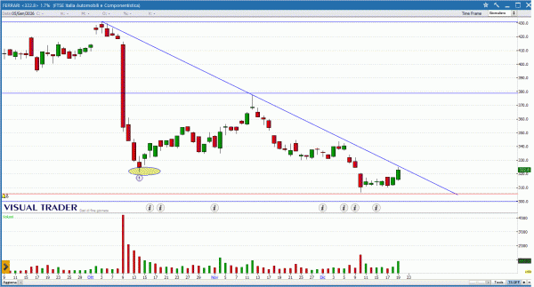 FERRARI disegna una Long white che testa la trendline ribassista scaturente dai massimi del 3 Ottobre. Il superamento di questo livello, fornirà un interessante segnale di inversione