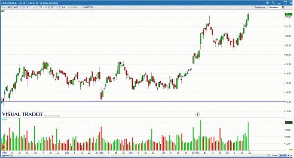 FINECO disegna una Long white che tocca nuovi massimi assoluti. Il superamento di area 22.3€. Il superamento di questo livello, potrebbe calamitare nuovi acquirenti