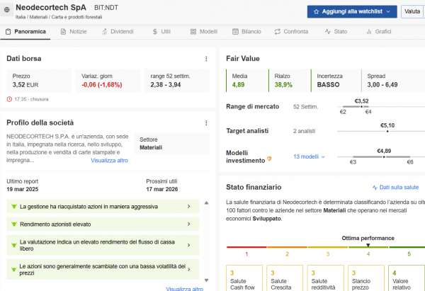 Neodecortech SpA ha un ottimo stato di salute finanziaria ed è fra i titoli più sottovalutati e con secondo InvestingPro. La Media dei 13 modelli di investimento utilizzati individua un Fair Value a 4.89€ con un Rialzo potenziale  38.9%. La media dei target degli analisti è a 5.1€