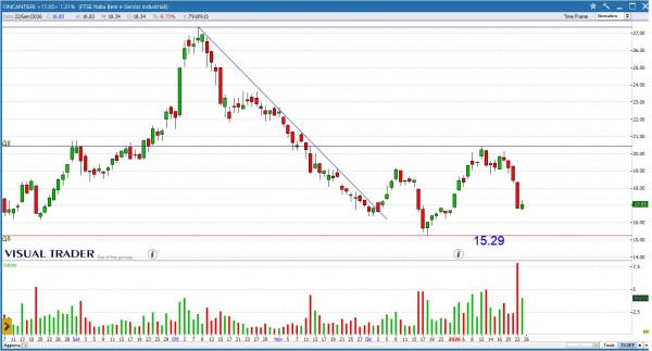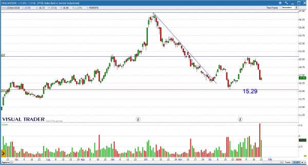 Violente prese di profitto colpiscono FINCANTIERI (-14.02% negli ultimi 5 giorni). I prezzi si riportano in prossimità del supporto in area 15.3€, che potrebbe opporsi a una eventuale ulteriore discesa dei prezzi