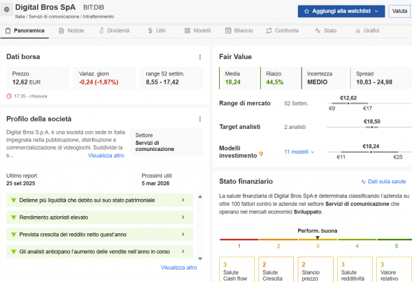 Secondo WarrenAI, Digital Bros è il classico titolo con “value trap” scritto in piccolo e “explosive upside” in grassetto: la valutazione e il potenziale di ripresa sono evidenti, ma senza segnali tecnici di inversione e con rischi di liquidità, è meglio aspettare conferme di svolta nei prezzi o nei fondamentali. Il prossimo catalizzatore sarà la pubblicazione dei risultati il 05.03.2026: una sorpresa positiva potrebbe ribaltare lo scenario tecnico.