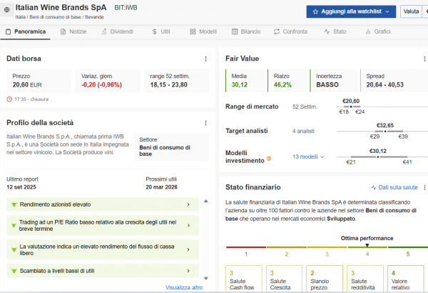 Italian Wine Brands ha un ottimo stato di salute finanziaria ed è fra i titoli più sottovalutati e con secondo InvestingPro. La Media dei 13 modelli di investimento utilizzati individua un Fair Value a 30.12€ con un Rialzo potenziale  del 46.2%. La media dei target dei 5 analisi è pari a 32.65€