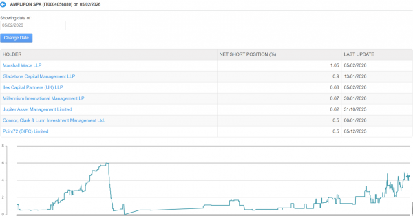Rimane sotto la pressione dei ribassisti AMPLIFON che (come evidente nell’immagine elaborata da Big Short Hunter https://www.sostrader.it/big-short-hunter-lp) è shortata da 7 investitori hanno aperto posizioni corte sul 4.92% del capitale. Fin quando non scatteranno le ricoperture il titolo rimane pericoloso.