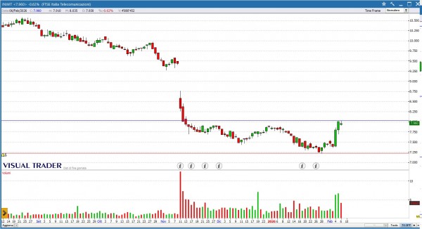 INWIT fornisce interessanti segnali di inversione della forza relativa: +6.99% nelle ultime 5 sedute. I prezzi si riportano a contatto con la resistenza psicologica degli 8€: una chiusura sopra tale livello, potrebbe aprire il campo a un ulteriore apprezzamento
