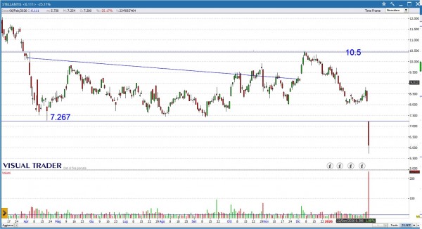 Un brutale sell off investe STELLANTIS che perde oltre ¼ del proprio valore nel giro di poche ore. I prezzi toccano un minimo a 5.835€ riportandosi su livelli che non vedevamo dal maggio 2020 e dai quali ci attendiamo un veloce rimbalzo tecnico