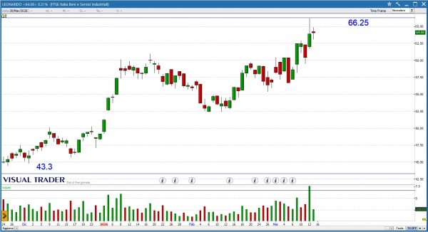 LEONARDO mostra straordinaria forza relativa toccando giovedì i massimi assoluti a 66.25€. Attendiamo un veloce consolidamento, che ci consenta di trovare un punto di ingresso a più basso rischio