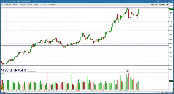 SNAM disegna una white Marubozu che si riporta a contatto con la resistenza chiave in area 6.65€. Una chiusura superiore a questo livello, fornirà un solido segnale di continuazione rialzista