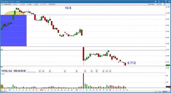 STELLANTIS è la peggior blue chips della settimana (-7.44%) e tocca i minimi dal 20 Maggio 2020. Attendiamo l’interruzione della serie di massimi giornalieri decrescenti per provare a catturare un veloce rimbalzo
