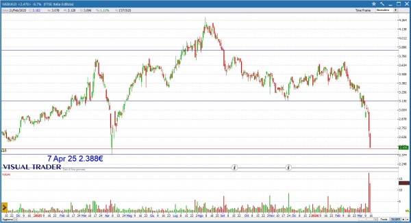 Violento sell off colpisce WEBUILD che perde il 19.35% nelle ultime 5 sedute. Monitoriamo il supporto in area 2.4€ su cui potremmo attenderci un tentativo di rimbalzo
