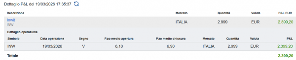 Come da prassi abbiamo liquidato le azioni in asta di chiusura (al prezzo di 6.9€) realizzando un gain di 2.399,20€ in poche ore