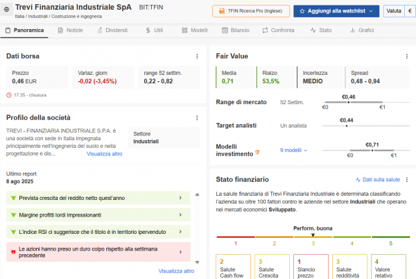 TREVI ha un discreto stato di salute finanziaria ed è fra i titoli più sottovalutati e con secondo InvestingPro. La Media dei 9 modelli di investimento utilizzati individua un Fair Value a 0.71€ con un Rialzo potenziale del 53.5%.