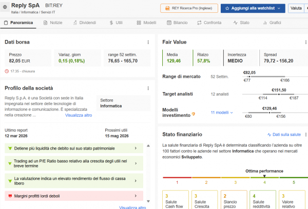 REPLY ha un ottimo stato di salute finanziaria ed è fra i titoli più sottovalutati e con secondo InvestingPro. La Media degli 11 modelli di investimento utilizzati individua un Fair Value a 129.45€ con un Rialzo potenziale del 57.8%. Il target price medio di 12 analisti è a 151.5€