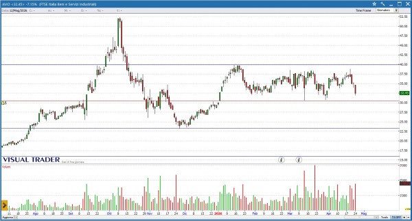 AVIO viene colpita da un violento sell off (-11.7% nelle ultime 5 sedute). Monitoriamo il supporto psicologico a 30€ sul quale potremmo assistere a un tenativo di reazione dei prezzi