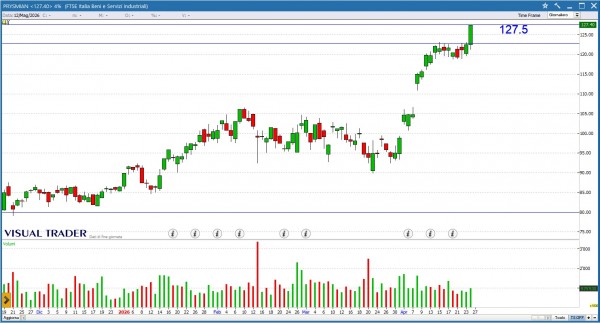 PRYSMIAN accelera al rialzo disegnando una Long white che esplode nei volumi e nella volatilità a seguito della formazione di nuovi massimi. Il superamento di area 127.5€ potrebbe calamitare nuovi acquirenti