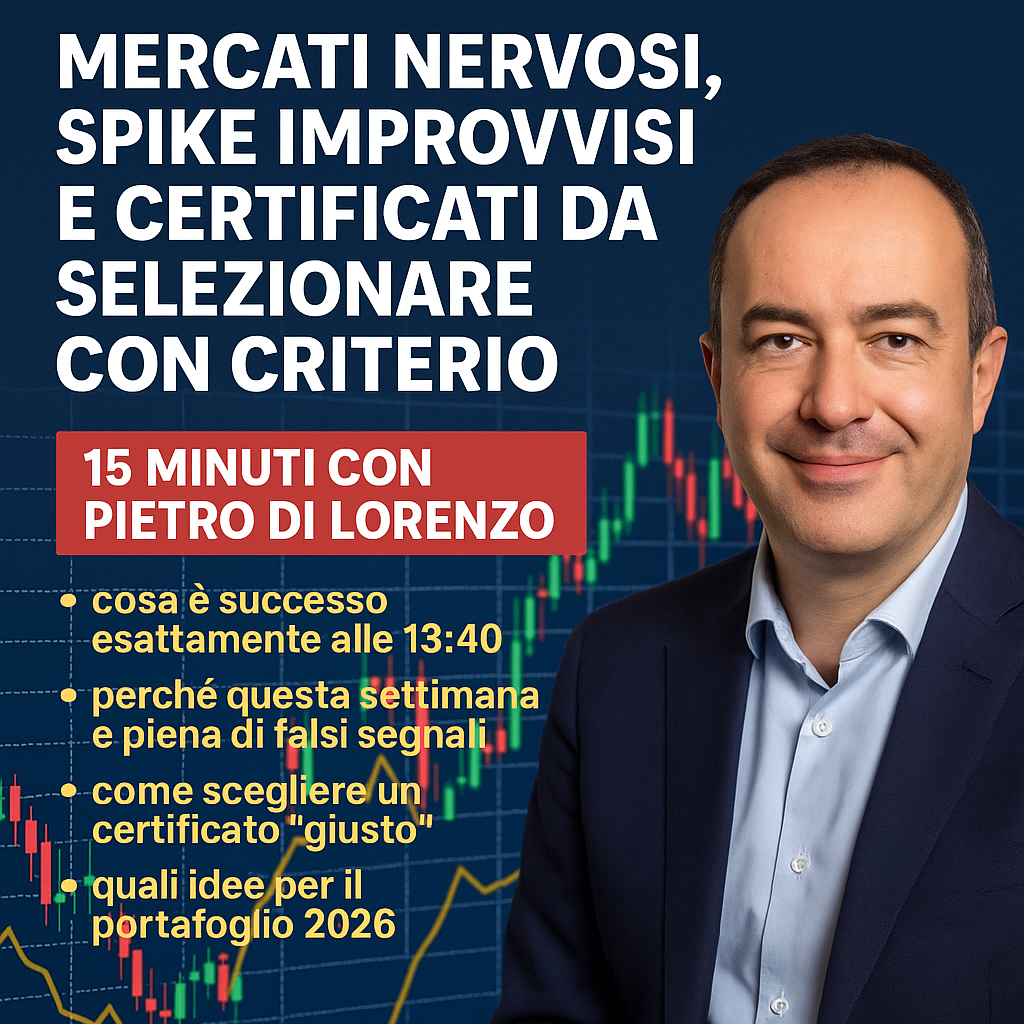 📉📈 Mercati nervosi, spike improvvisi e certificati da selezionare con criterio. E’ successo davvero di tutto: dal mini–shock di metà giornata ai trade lampo su Leonardo, fino alle strategie per orientarsi in un mare di oltre 11.000 certificati. 🔍 Pietro spiega: • cosa è successo esattamente alle 13:40, • perché questa settimana è piena di […]