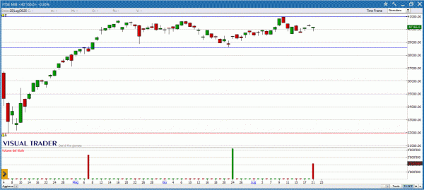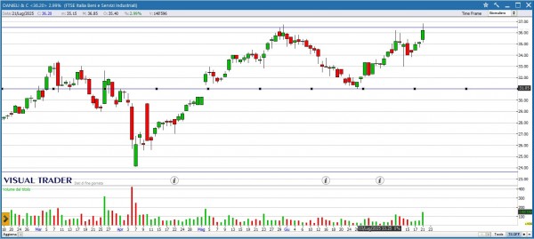 DANIELI disegna una long white che testa la resistenza in area 36.5€: una chiusura superiore a questo livello, fornirà un solido segnale di continuazione rialzista