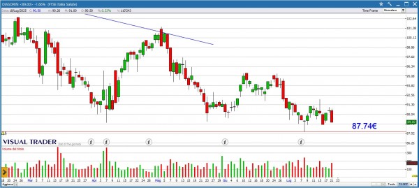 DIASORIN disegna una Long Black che riporta i prezzi in prossimità dei minimi toccati l’8 luglio a 87.74€. Monitoriamo questo livello su cui potremmo attenderci una reazione degli acquirenti