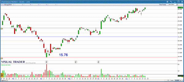 STM fornisce un solido segnale di continuazione rialzista disegnando una Long white che tocca i massimi annuali. Il target a 30€ sembra alla portata del titolo nel breve.