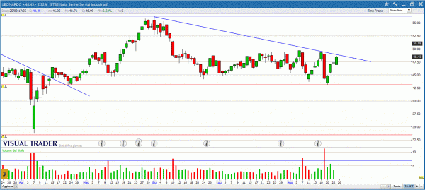LOENARDO testa la trendline ribassista scaturente dai massimi toccati il 2 giugno a 56.18€. Il superamento di questo livello, fornirà un interessante segnale LONG