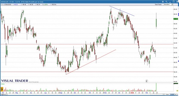 MONCLER strappa al rialzo dopo la pubblicazione dei risultati. Attendiamo un veloce consolidamento al fine di individuare un punto di ingresso a più basso rischio